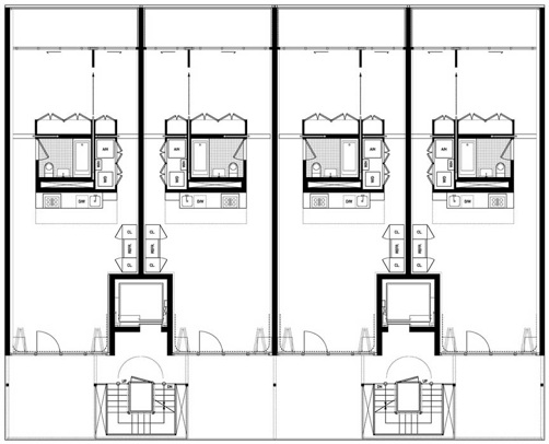 Ein eingestellter Küchen- und Badezimmerblock definiert den Wohn- und Schlafbereich.